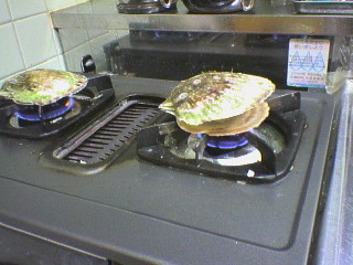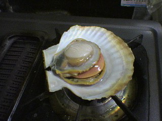 これは、焼き帆立をつくっているところ、、殻が開き始めました!