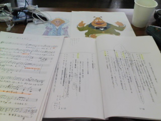 まこりんの前には、こんなふうに台本やら楽譜やらキャラクターの絵が。